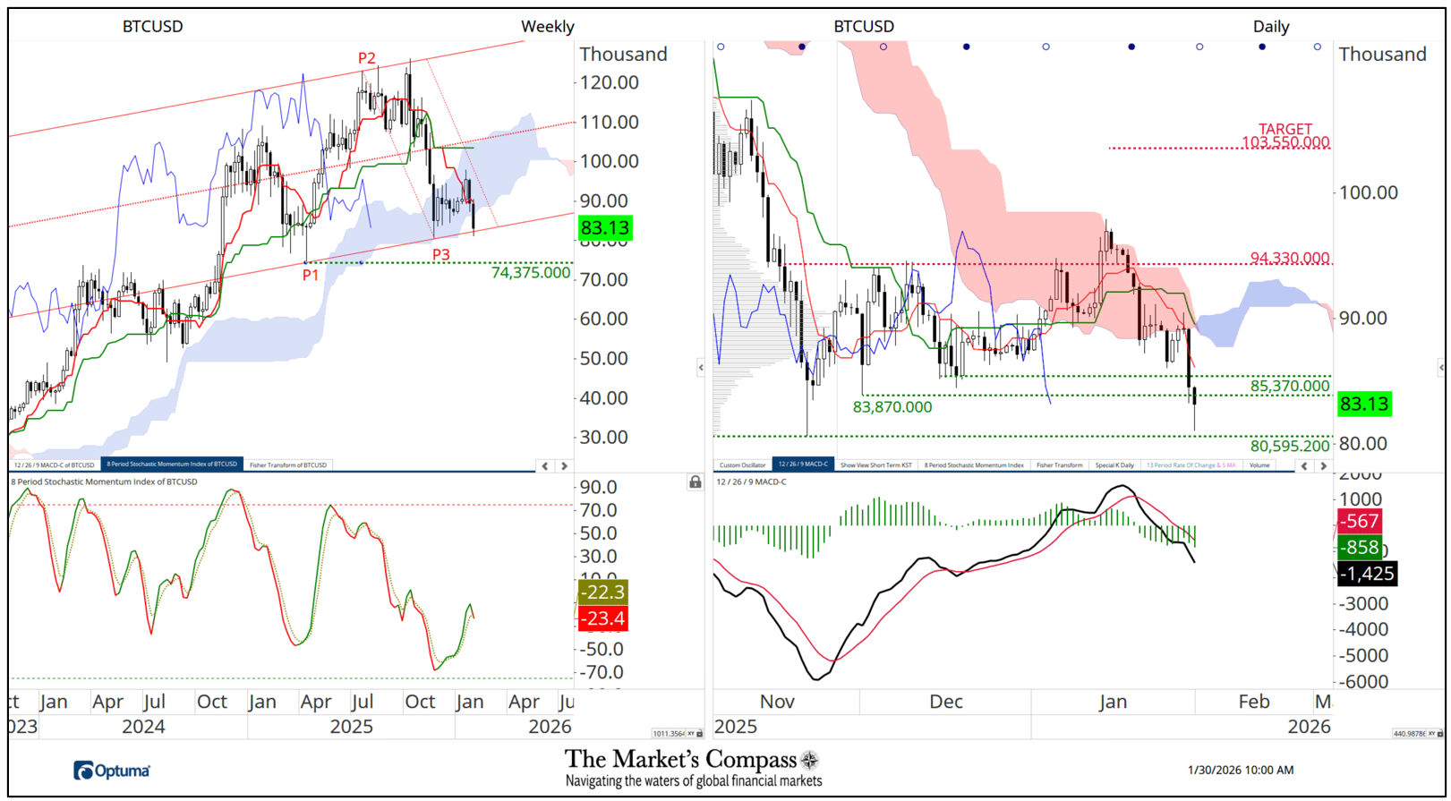 With a break of the support band (83,870 / 85,370) Bitcoin found itself testing potential the intra-day support at the November 21st low (80,595.20). It avoided a full test and has bounced. We may have seen a short-term low today but the price structure from the January 14th high is “murky”, is it a three wave A-B-C decline or is it 1-2-3 of a five-wave decline with 4 and 5 to unfold? Only a rally back above the broken support band and a follow-through that overtakes Daily Cloud resistance would support the A-B-C thesis.